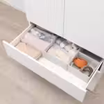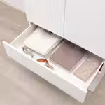 Лучшее решение, если вы любите, чтобы вещи лежали на своих местах и были скрыты от глаз. Здесь четыре выдвижных ящика двух разных размеров, в которые поместятся все предметы личной гигиены. А на столешницу можно положить всё