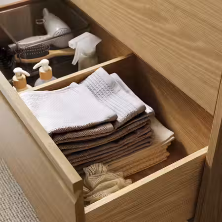 Современный стиль мебели для ванной ЭНГШЁН подчеркивается интегрированными ручками и лаконичным дизайном.