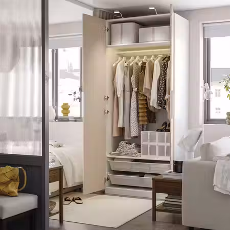С помощью раздвижных дверей СКЮТТА вы сможете доработать имеющееся у вас решение для хранения, создать гардеробную или разделить комнату на две части.