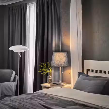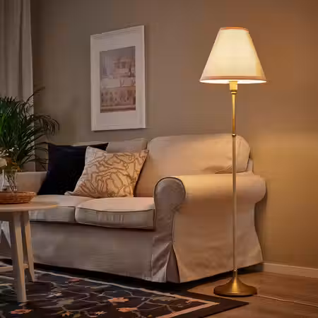 Абажур торшера ТОГАРП направлен вверх и освещает приятным отраженным светом всю комнату.