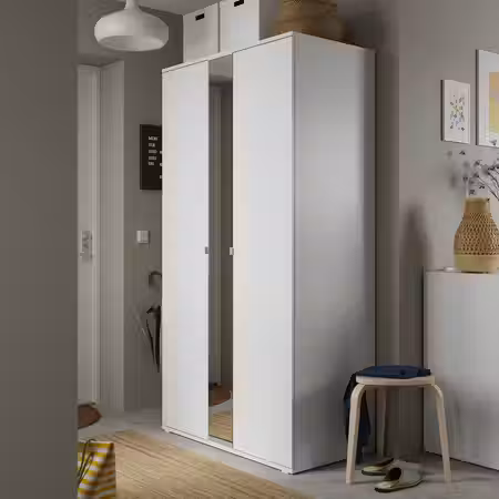 Добавьте к своему гардеробу PAX этот промежуточный модуль — в нём можно расставить красивые предметы и хранить любимую одежду и аксессуары. А с помощью стеклянных и деревянных полок с регулируемой высотой вы легко адаптируете пространство под
