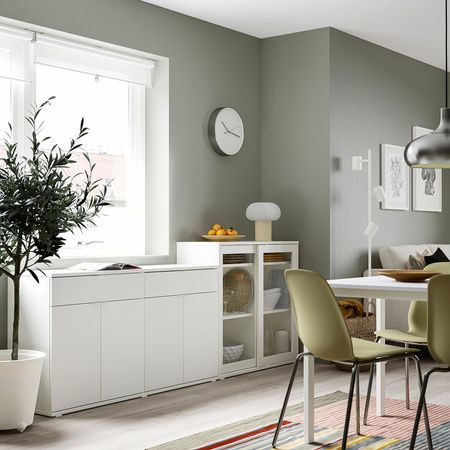 Вся мебель для хранения серии VIHALS выполнена в едином стиле, что позволяет визуально объединить интерьер столовой зоны, коридора и любых других помещений.