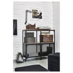 Открытая задняя стенка этого лаконичного стеллажа из металла и дерева обеспечивает удобное распределение проводов и доступ к розеткам.