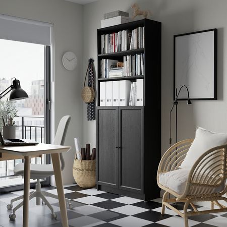 BILLY / OXBERG 794.833.59 Стеллаж + стекл. двери/доп. модуль, чёрный под дуб 40x30x237 см