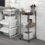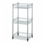 В трех металлических корзинах удобно хранить овощи, консервы, бутылочки с шампунем или шарфы и перчатки. Содержимое не выпадет на пол.