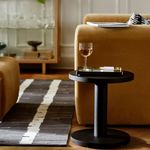 Поверхность этого безворсового шерстяного ковра украшает бежево-черный геометрический орнамент.