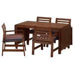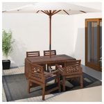 Откидные столешницы легко установить и убрать, что позволяет регулировать размер стола по необходимости. Отверстие в центре столешницы позволяет установить зонт от солнца. Мебель обработана полупрозрачной морилкой в несколько слоев.