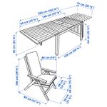 Стол (мин. длина 140 см, ср. длина 200 см, макс. длина 260 см, ширина 78 см, высота 72 см); стул (ширина 63 см, глубина 80 см, высота 101 см; ширина сиденья 44 см, глубина сиденья 48 см, высота сиденья 41 см).