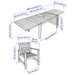Стол (мин. длина 140 см, макс. длина 260 см, ширина 78 см, высота 72 см). Стул (ширина 62 см, глубина 65 см, высота 82 см, ширина сиденья 49 см, глубина сиденья 49 см, высота сиденья 41 см).