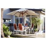 Отверстие в центре столешницы позволяет установить зонт от солнца. Спинку можно установить в одном из трех положениях. Изменить положение спинки можно с помощью специальной ручки на боковой поверхности сиденья.
