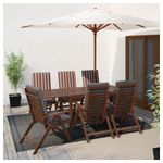Откидные столешницы легко установить и убрать, что позволяет регулировать размер стола по необходимости. Отверстие в центре столешницы позволяет установить зонт от солнца. Мебель обработана полупрозрачной морилкой в несколько слоев.