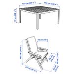 В комплект входит: стол (длина 140 см, ширина 140 см, высота 72 см), стул (ширина 63 см, глубина 80 см, ширина сиденья 44 см, глубина сиденья 48 см, высота сиденья 41 см, высота 101 см).