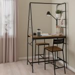 Прочные, устойчивые и простые в уходе стальные рейки для организации хранения и гладкая меламиновая столешница с отделкой под темное дерево.