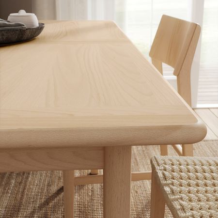 В 4-местный комплект столовой мебели в современном стиле входят деревянный стол покрытый светлой морилкой, который можно раздвинуть на 6 человек, и деревянные стулья с мягкой набивкой сиденья и удобной изогнутой спинкой.