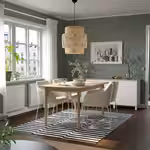 В 4-местный комплект столовой мебели в современном стиле входят деревянный стол покрытый светлой морилкой, который можно раздвинуть на 6 человек, и деревянные стулья с удобной изогнутой спинкой.