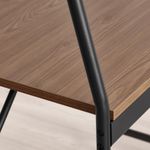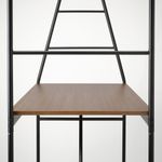 Прочные, устойчивые и простые в уходе стальные рейки для организации хранения и гладкая меламиновая столешница с отделкой под темное дерево.