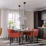 6-местная обеденная группа включает в себя раскладной стол из дерева и металла, рассчитанный на 4, 6 или 8 человек, и стулья с современным дизайном и съемными моющимися чехлами.
