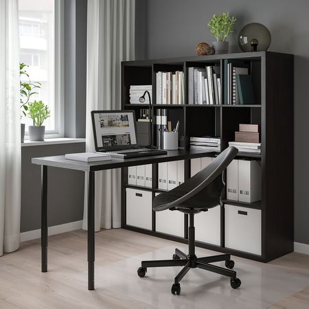Столешницу и ножки можно прикрепить к стеллажу КАЛЛАКС при помощи фурнитуры ИНЛЭГГ.