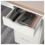 Матовая краска защищает поверхность столешницы от повреждений и царапин и придает ей гладкость. Благодаря лицевой отделке задней панели модуль можно поставить в центр комнаты. Благодаря стопорам ящик не выпадает из каркаса.