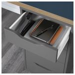 Матовая краска защищает поверхность столешницы от повреждений и царапин и придает ей гладкость. Благодаря лицевой отделке задней панели модуль можно поставить в центр комнаты. Благодаря стопорам ящик не выпадает из каркаса.