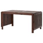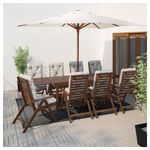 Откидные столешницы легко установить и убрать, что позволяет регулировать размер стола по необходимости. Отверстие в центре столешницы позволяет установить зонт от солнца. Мебель обработана полупрозрачной морилкой в несколько слоев.