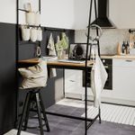 Прочные, устойчивые и простые в уходе стальные рейки для организации хранения и гладкая меламиновая столешница с отделкой под темное дерево.