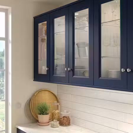 Стеклянная дверца АКСТАД с синей матовой поверхностью, плавными линиями и встроенной стеклянной панелью.