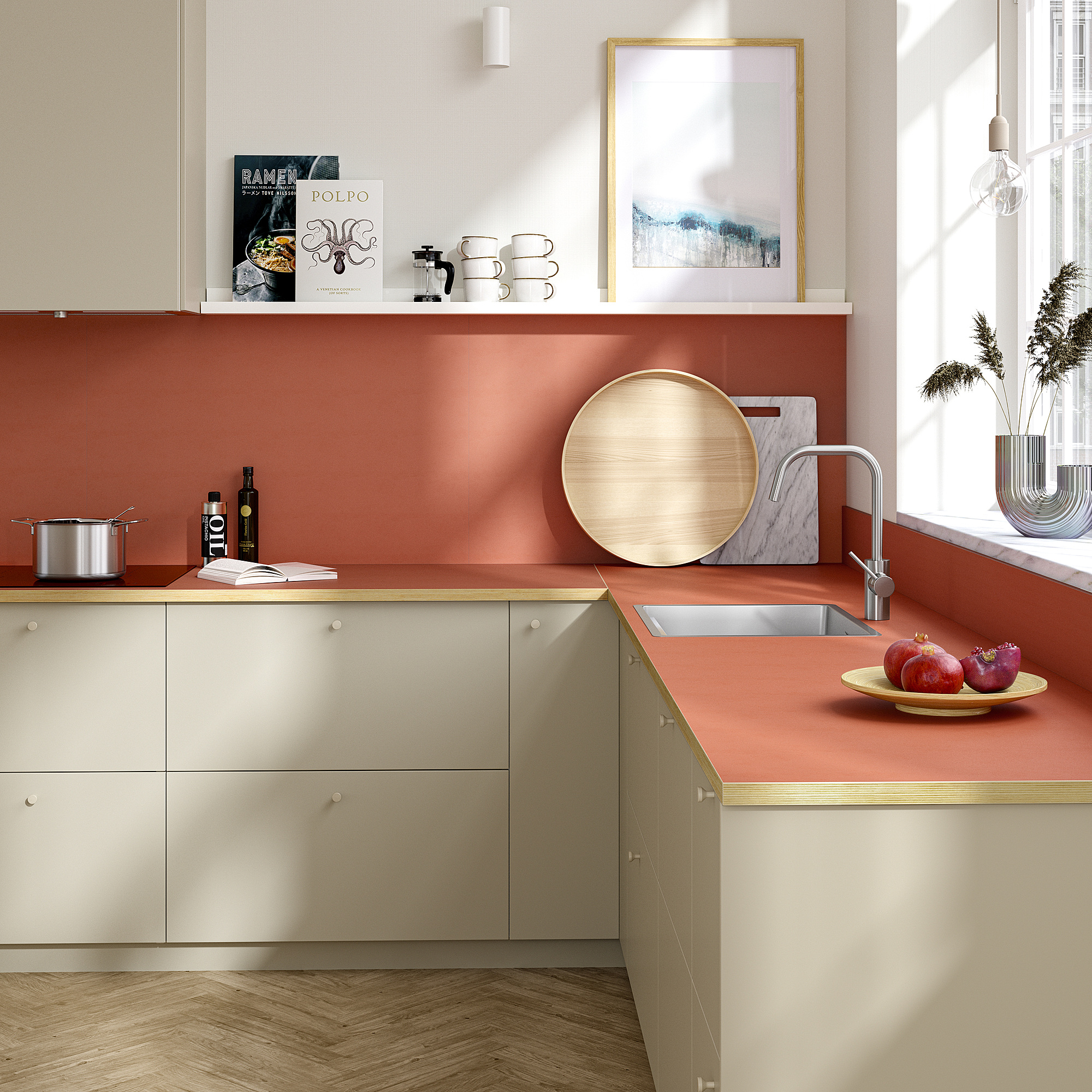 Создайте гармоничное решение, дополнив столешницу подходящей настенной панелью.