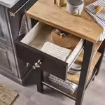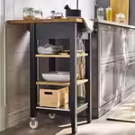 На тележку можно поставить грязную посуду, блюда для сервировки стола и другие нужные вещи. Зафиксируйте ее на месте или перевезите туда, где она вам больше всего нужна. Деревянная столешница сделает интерьер уютнее и ближе к стилю