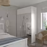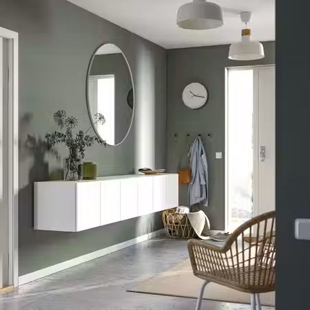 Это решение с раковиной в центре, одним выдвижным ящиком и открытыми шкафами по бокам визуально увеличивает пространство благодаря навесному способу установки и наполняет комнату уютом за счёт отделки из тёплого дерева.