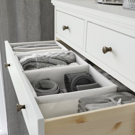 В один ящик можно положить носки и футболки, а в другой — спортивную одежду или сложенные свитера.