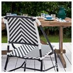 Нестареющий графический узор на сиденье и спинке сплетен вручную из искусственного ротанга и сочетается с черно-белыми деталями на ножках стула.