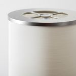 Декоративный напольный светильник с текстильным белым абажуром вытянутой формы, сквозь который по комнате распространяется мягкий и теплый свет.
