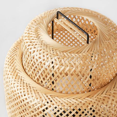 Для абажура используется материал, который получают из переработанных пластиковых бутылок, а основание изготовлено из сертифицированной древесины.