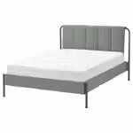 Мягкая серо-зеленая ткань «кульста» в полоску придает кровати особый характер, и на детали каркаса нанесено порошковое покрытие в тон ткани.