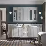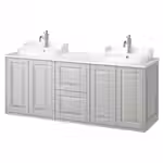 В комплект входит: 1 шкаф под раковину с ящиками, 2 шкафа под раковину с дверьми, 1 столешница, 2 полуутопленные раковины, 1 сифон и 2 смесителя.