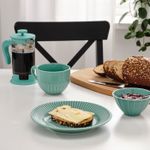 Сделать сервировку стола яркой помогут бирюзовые десертные тарелки СТРИММИГ. Их можно комбинировать с товарами этой же серии или с другой посудой из каменной керамики.