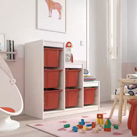Дополните этот широкий сосновый каркас полками, разноцветными пластиковыми контейнерами и легкими сетчатыми контейнерами, чтобы создать практичное решение для хранения.