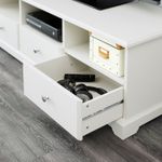 Ящики с плавным ходом и стопором.Отсутствие задней панели помогает собрать и организовать провода.Мы рекомендуем, чтобы тумба была немного шире, чем установленный на ней телевизор. Эта тумба подходит для телевизора до 57 дюймов.