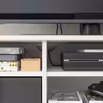 Открытые полки — оптимальное решение для установки телевизора и хранения проводов, так как сигналу от пультов дистанционного управления ничего не мешает.
