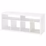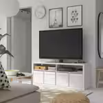 Удобная тумба под ТВ, в которой достаточно места для техники и аксессуаров. Если вам нужны закрытые решения для хранения, просто поставьте коробки или вставки в нижние отделения. А благодаря открытой конструкции сзади вы легко подключите все