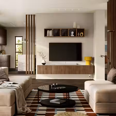 Секрет идеального порядка в гостиной прост: достаточно места для хранения и возможность спрятать провода различных устройств.