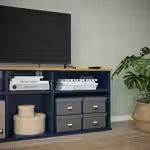 Открытые полки — оптимальное решение для установки телевизора и хранения проводов, так как сигналу от пультов дистанционного управления ничего не мешает.