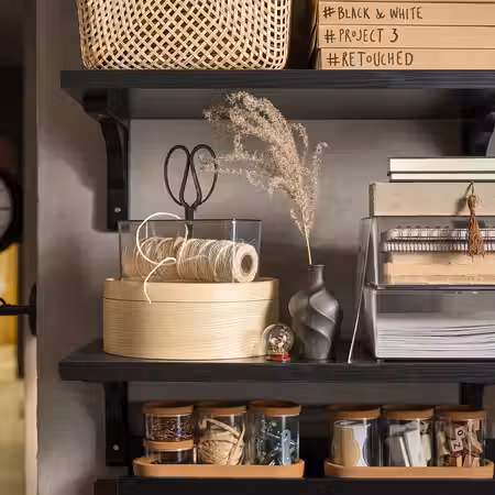 Всего несколько простых шагов — и с этой коричнево-черной полкой вы создадите решение для хранения и выберете стиль, который вам нравится. С одной стороны полки край скошенный, а с другой — гладкий. Просто поверните ее —