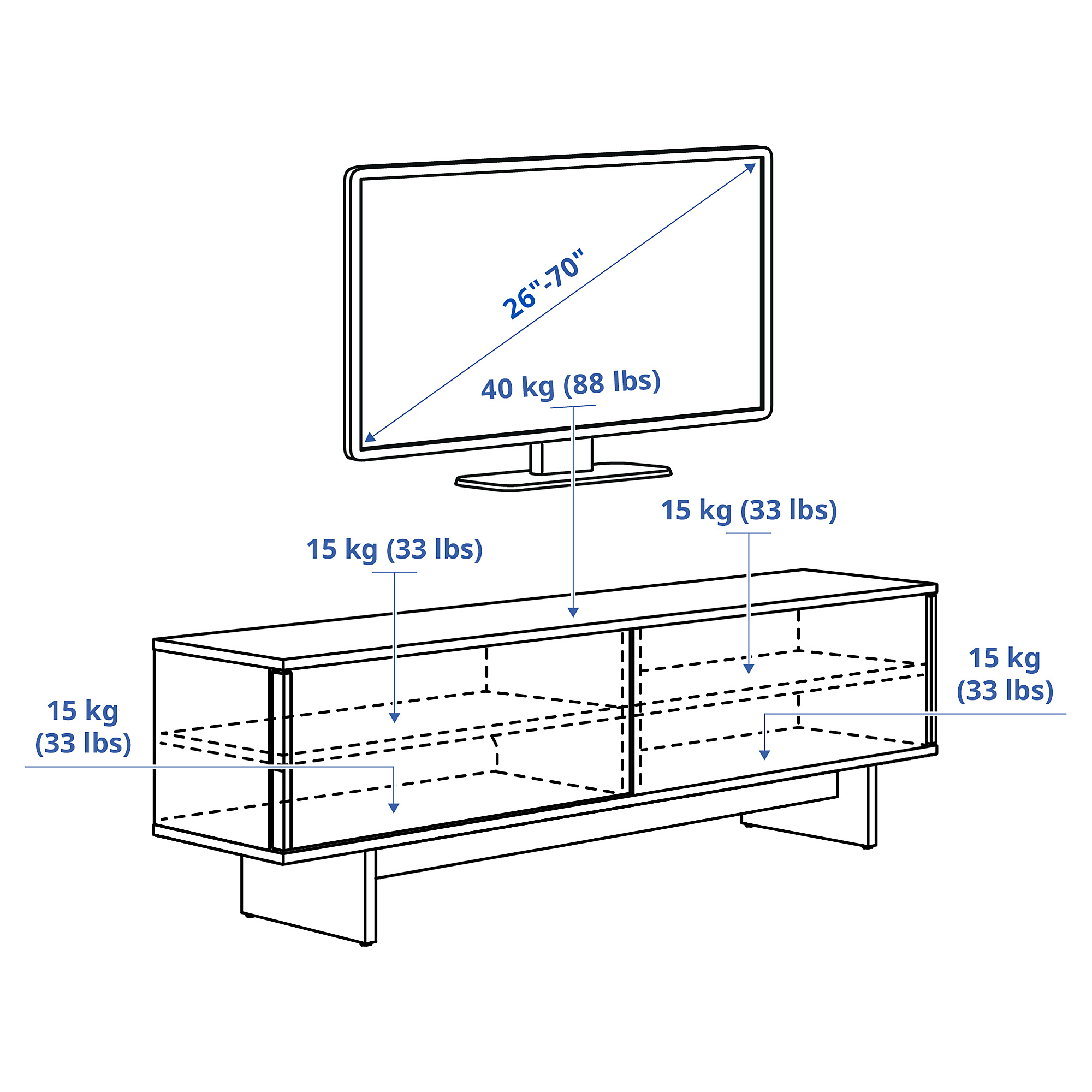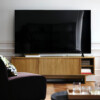 Мы рекомендуем выбирать тумбу под ТВ шириной немного больше телевизора. Эта тумба подходит для ТВ до 70 дюймов. На нее можно также поставить телевизор большего размера, если его вес не превышает указанную максимальную нагрузку на верхнюю панель тумбы.