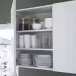 В открытых напольных шкафах достаточно места для мисок и компактных кухонных приборов, к примеру, тостера, миксера или рисоварки.
