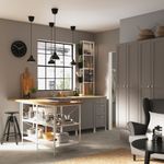 Серия ЭНХЕТ позволяет создавать комбинации мебели, чтобы начать в кухне новую жизнь. В этом решении есть много места на открытых полках и за глухими фасадами, а также кухонный островок, который облегчает общение во время совместного приготовления ужина.