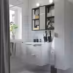 Благодаря этой комбинации вы окажетесь в центре внимания — раковина и шкаф с зеркалом помогут привести себя в порядок, а вместительные открытые шкафы по бокам обеспечат достаточно места для хранения необходимых вещей.