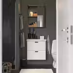 Шкафы под раковину с ящиками обеспечат отличный обзор разных мелочей, а зеркало на навесном шкафчике позволит с комфортом подготовиться к наступающему дню.