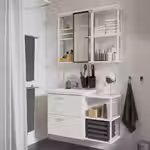 Шкафы под раковину с ящиками обеспечат отличный обзор разных мелочей, а открытые каркасы идеальны для корзин и сложенных полотенец.